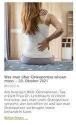 Osteoporose ist eine häufige Alters-Erkrankung des Knochens, die ihn anfälliger für Brüche macht. Jede vierte Frau über 50 leidet an Osteoporose. Am heutigen Welt-Osteoporose-Tag erklärt Frau Dr. Lerchbaum in einem Interview, was man unter Osteoporose versteht, wer betroffen ist und wie man Osteoporose vorbeugen sowie behandeln kann:
