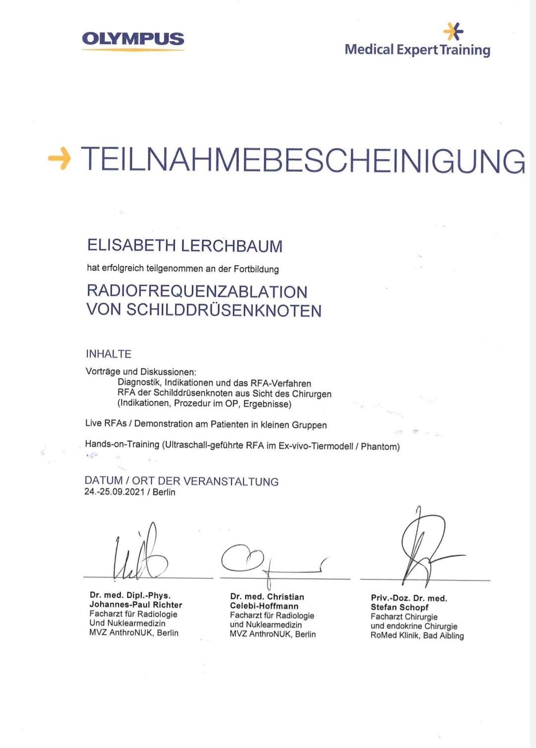 Um Ihnen in Zukunft eine möglichst individuelle Behandlung anbieten zu können, habe ich im Rahmen des Medical Expert Trainings in Berlin die Grundlagen der Radiofrequenzablation (RFA) von Schilddrüsenknoten erlernt.